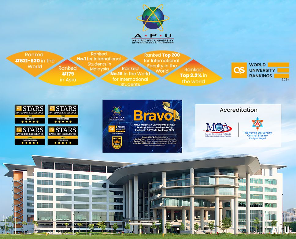 Asia Pacific University of Technology & Innovation (APU) is one of Malaysia’s premier private universities, renowned for its strong focus on technology, innovation, and creativity. APU prepares industry-ready graduates for meaningful roles in business and society globally through future-focused, industry-driven education.